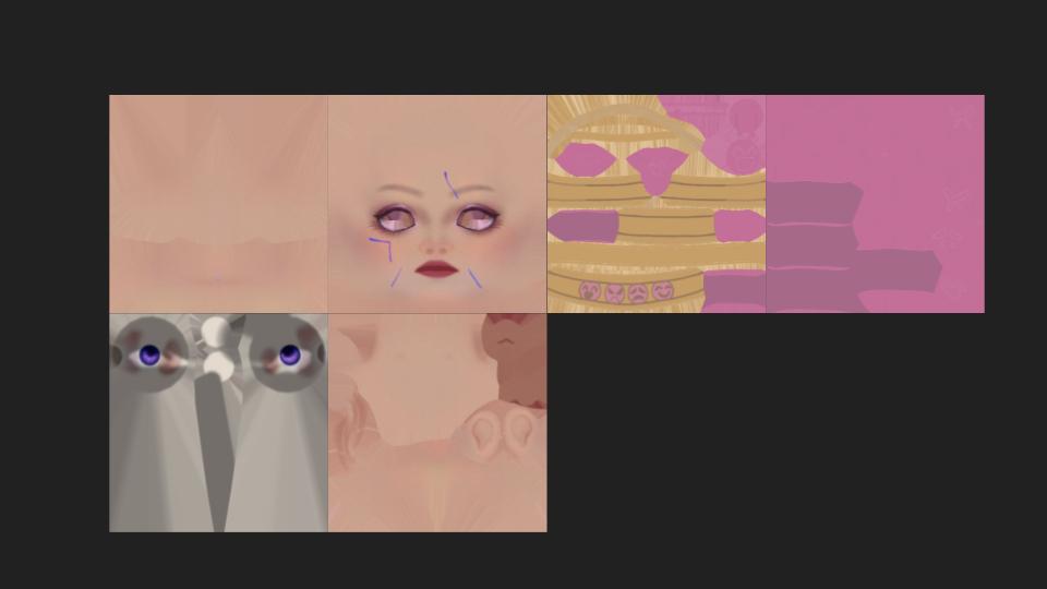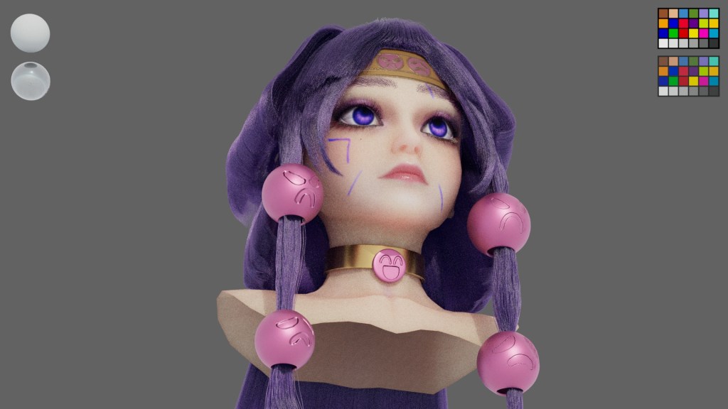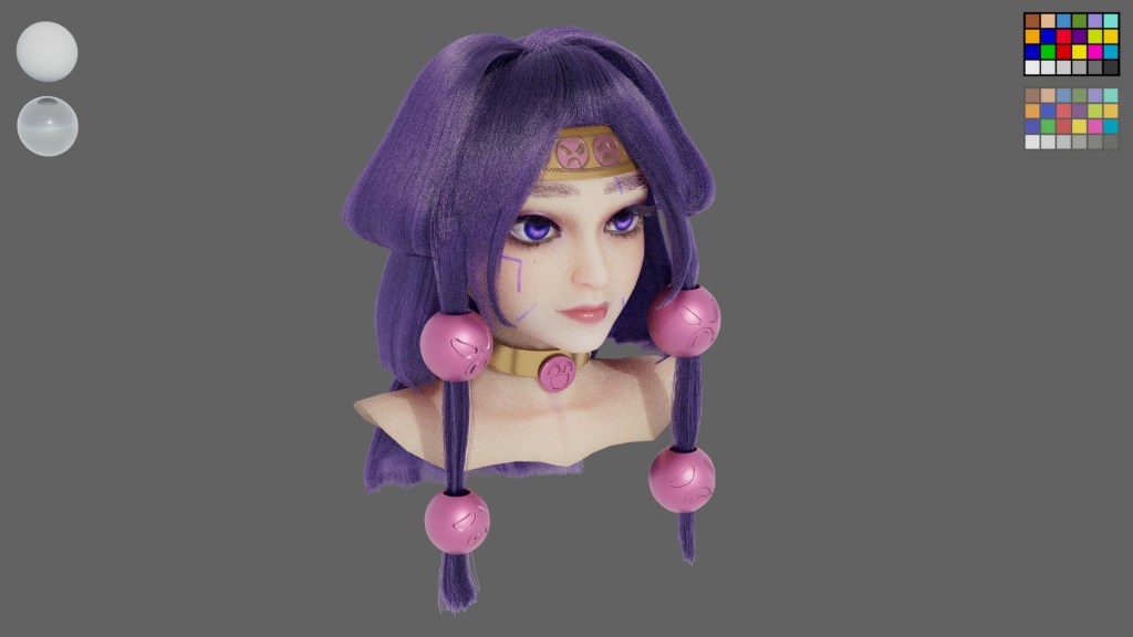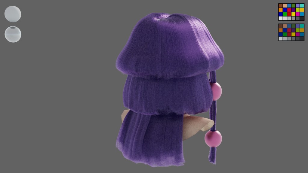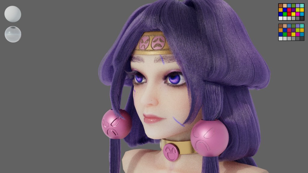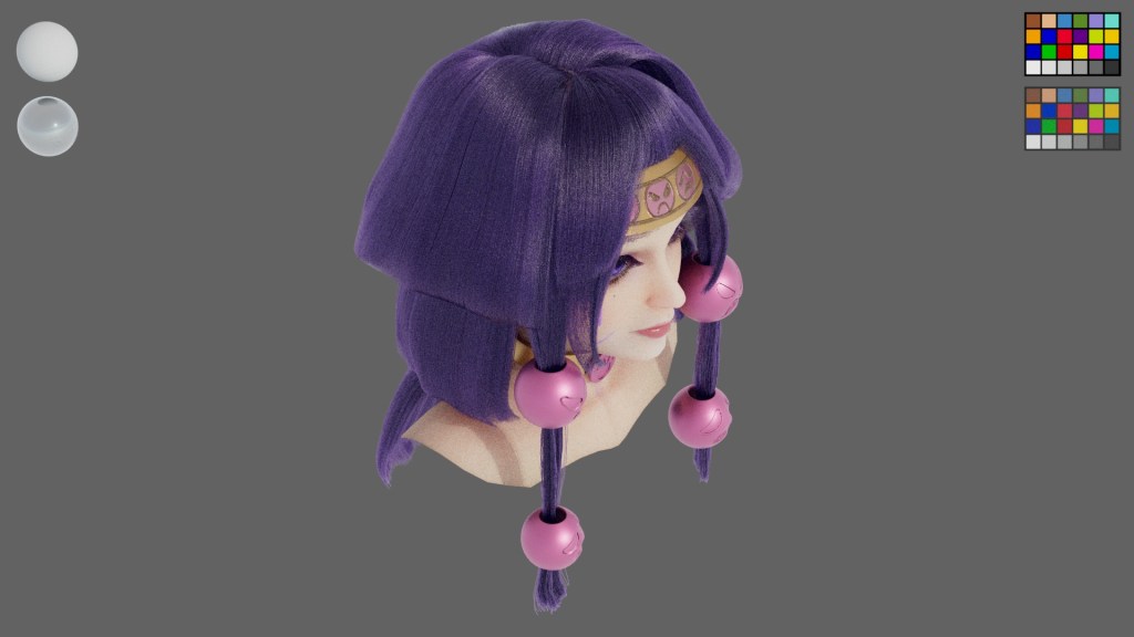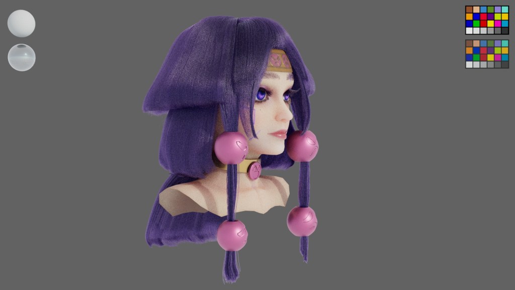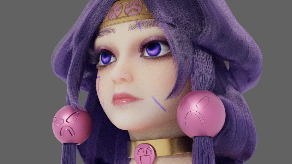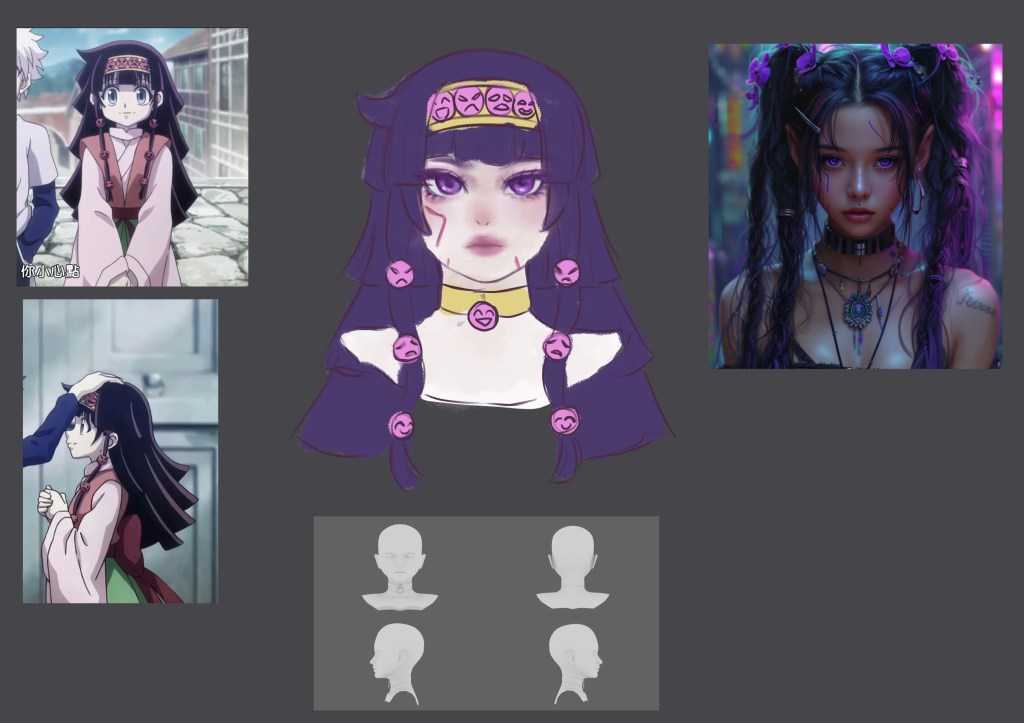 This project is inspired by a Japanese anime character named Alluka. I am impressed with the hairstyle, so I used it as my reference. As I want to design the model aged around 18 years old, I referred to photos of real people who have the same purple tone of make up. It is a three layer hairstyle, and they became thinner and longer from top to bottom. For decorations, I design them as shine as metal, but not all of them are made of metal. The pattern of the decoration on her head is embroidery.