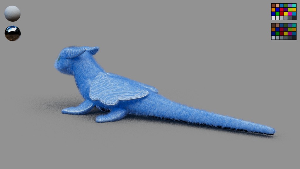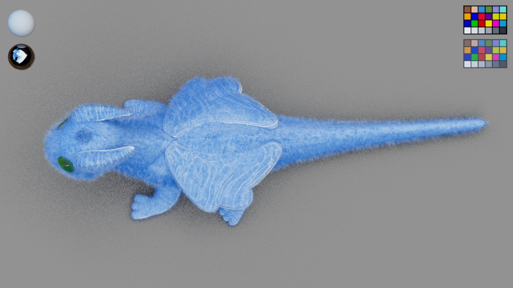 This project is about water ripples. The overall groom of the dragon is thin and soft. The decorations on the dragon, such as lacy on horns and wings, describe the water ripples. I also want to create another water ripple texture in the chest, so the dragon wears a water ripple pattern denim. In order to show the denim as well as make a difference with the overall groom, I create shorter and frizzy groom for the chest.
